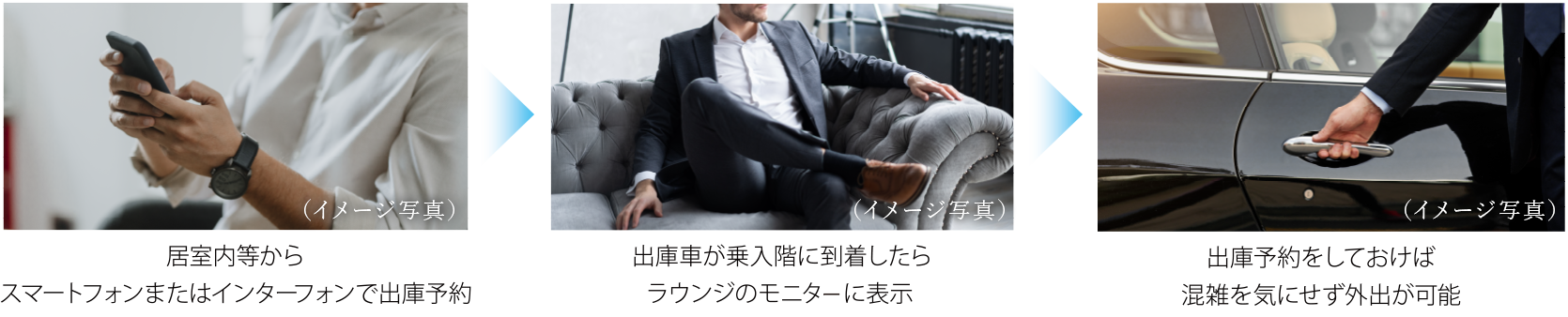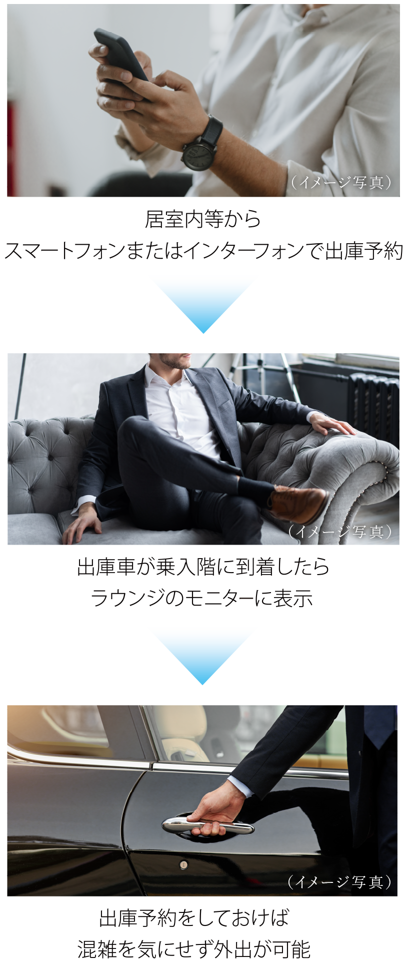 お部屋のインターフォンやスマートフォンから簡単操作で出庫予約や駐車設備の待ち状況の確認ができます。 出庫予約後はラウンジのモニターでも待ち順番が確認可能。出庫車が乗入階に到着したらモニターに表示されるので、ゆっくりとお待ちいただけます。 出庫予約をしておけば混雑を気にせず外出ができます。