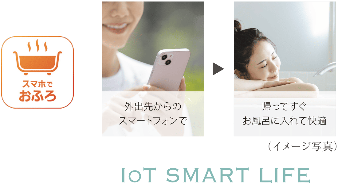 インターネットによってモノやコトがつながりあい、新しい機能や便利さがつくり出されるIoT(Internet of Things)。日々の利便性を進化させるIoTテクノロジーで、夢見た未来の暮らしを実感できます。外出先からスマートフォンで簡単にお湯はりの遠隔操作ができるので、帰宅後すぐに、ポカポカのお風呂に入ることができます。
