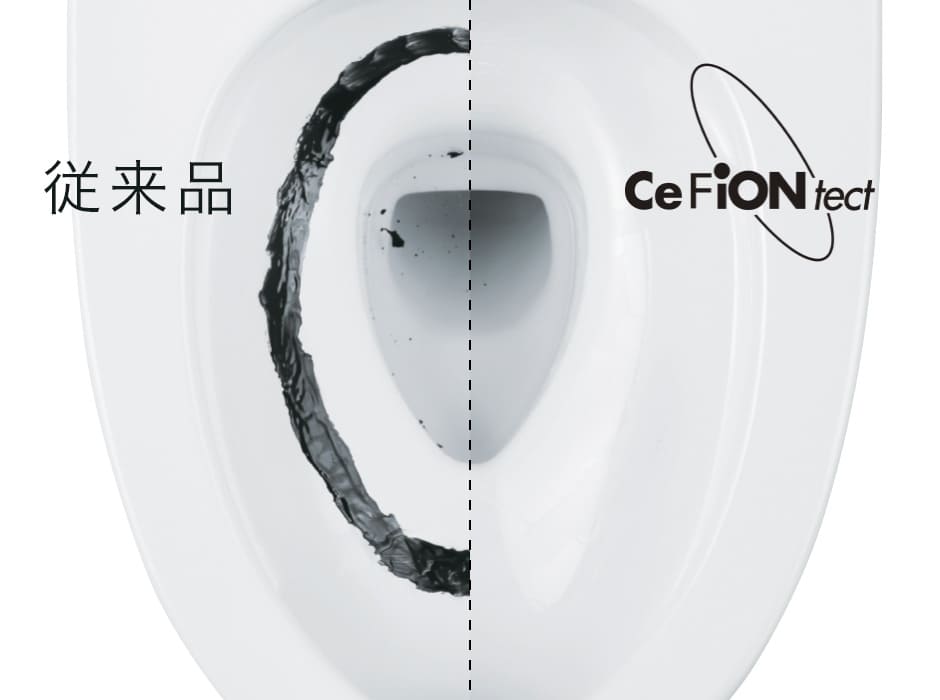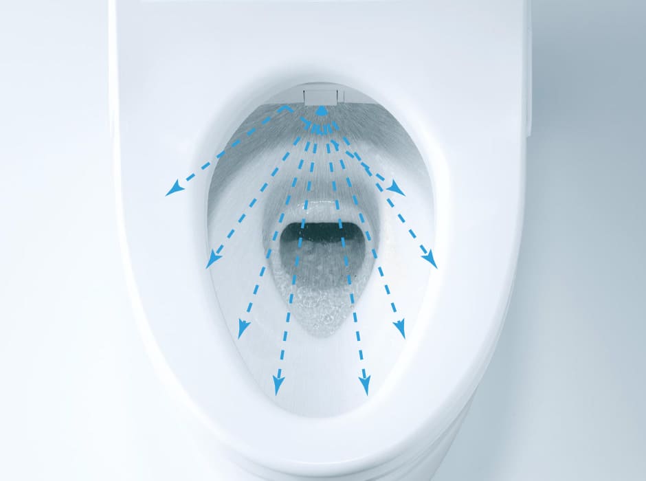 便器にミスト(水)をふきかけて、水のクッションを作り、便器を汚れから守ります。